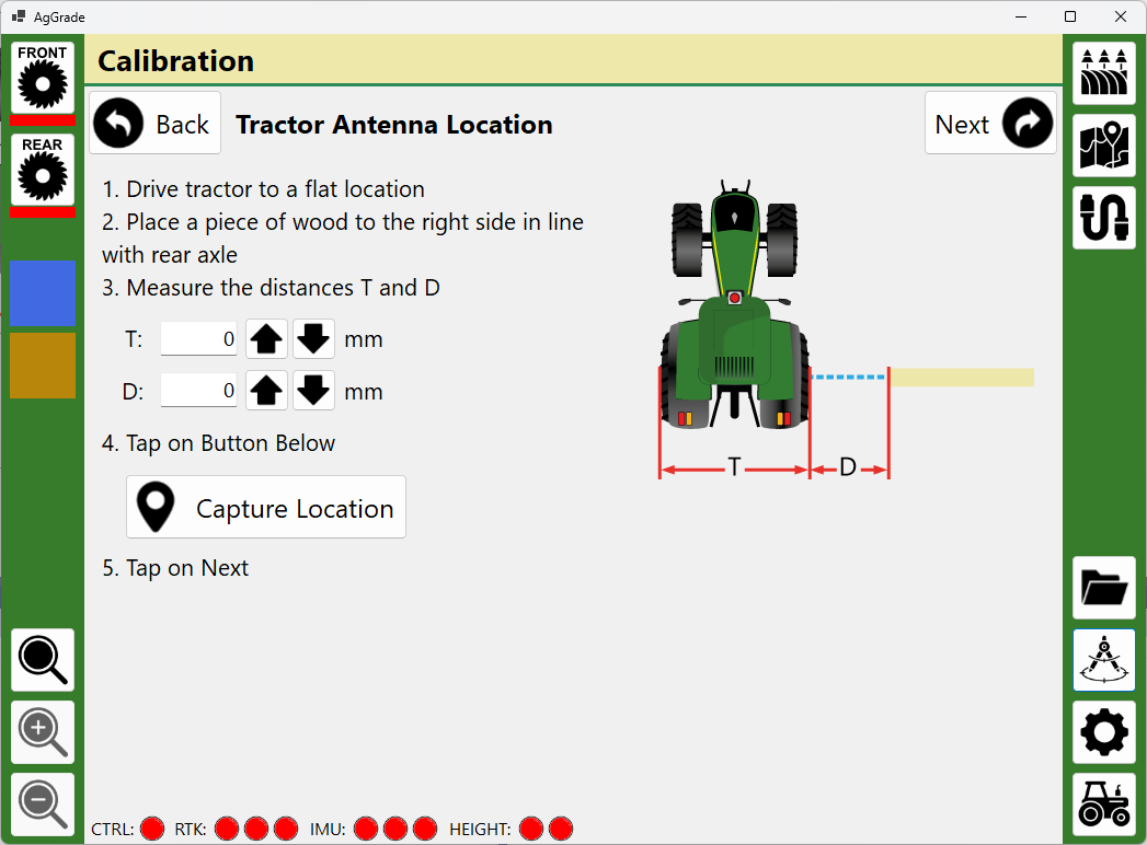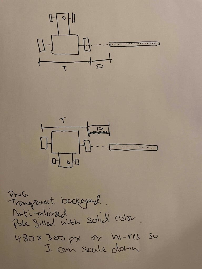 The attached image shows very roughly what I need. Two stylized images of a top down view of a tractor lining up with the same pole but from opposite directions. The tractor has to line up with the same end of the pole, so can’t just be an image rotation. I hope that makes sense. It needs to be clear that the pole lines up with the rear axle. There are two measurements the operator will need to make. I’m sure you can make something much nicer than my crude sketch.