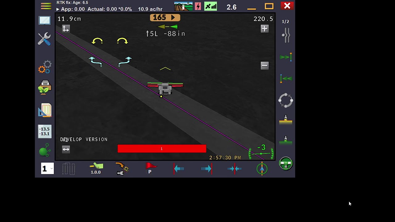 A few days later, I made some finer measurement adjustments and corrected IMU orientation then went back to the test area and noticed the guidance lines on the screen were north-south instead of east-west as I had set them. However, engaging autosteer followed my original but now invisible east-west lines. I deleted all tracks and made a new AB, but whenever autosteer was engaged the machine would turn about 90 degrees from the new line and follow heading that way. This behavior happens regardless of track type (AB, A+, Pivot).