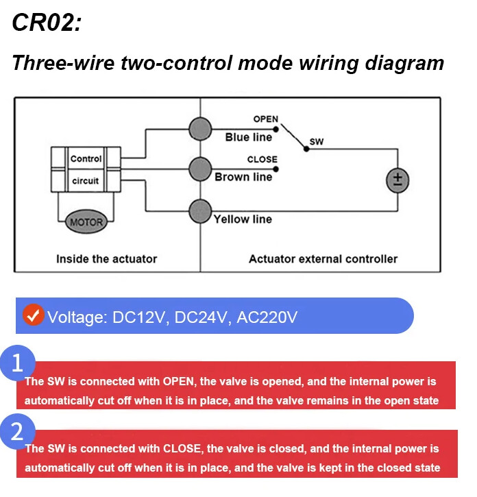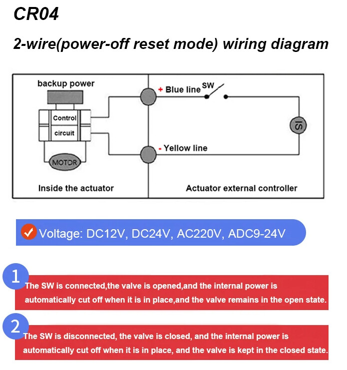 These 2 wire valves have a yellow wire that is negative and a blue that is positive. When current is removed a large cap motors it closed. The three wire valves have a negative wire and positive down either brown or blue drives either direction.