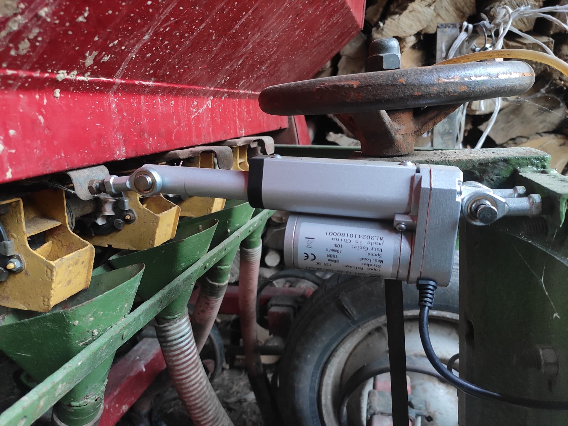 you can use linear actuators that have the same travel length as the slider in the pictures of your seed drill. Add a rubber element or spring if the length doesn’t match 100%. These linear motor can bend the slider if debris builds up. This one travels 50mm, looks like that is what the slider in your picture moves al well. Heads up only IP 54, you need to protect them from the elements (water etc.). Amazon.ca