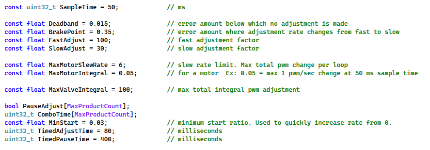 To keep the Rate App easier to use these values are set in the sketch. MaxMotorSlewRate was originally set to 2. This may be why the pid adjustment was sluggish. I removed a 0’ing out line for pwm adjust that should help for starting from last pwm. I have changed the motor control code (with the help of Copilot) to have a more granulated pwm step. These changes will be in the Development branch on github.